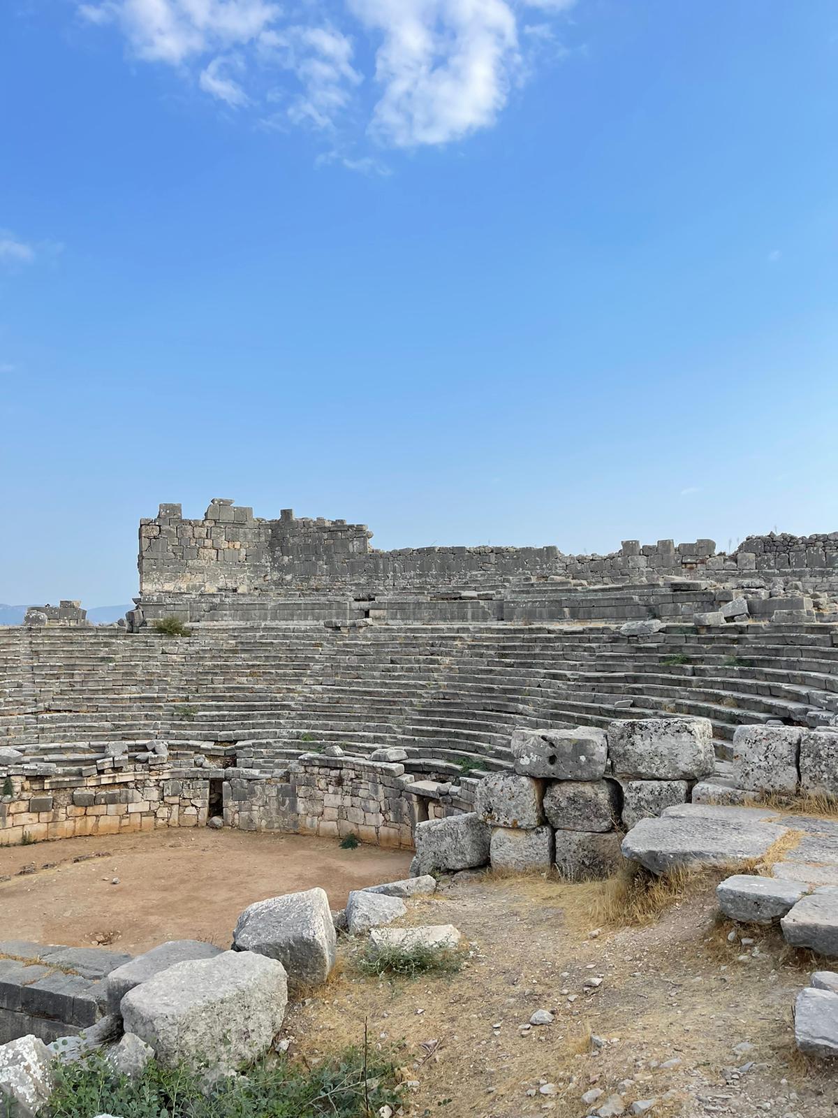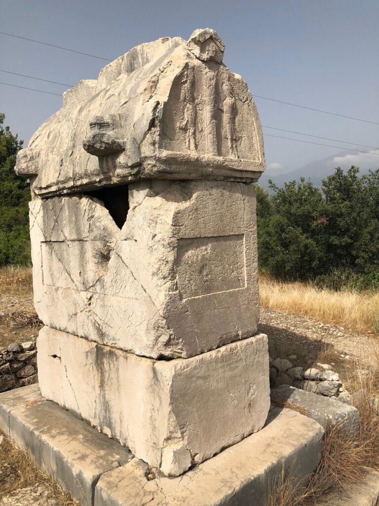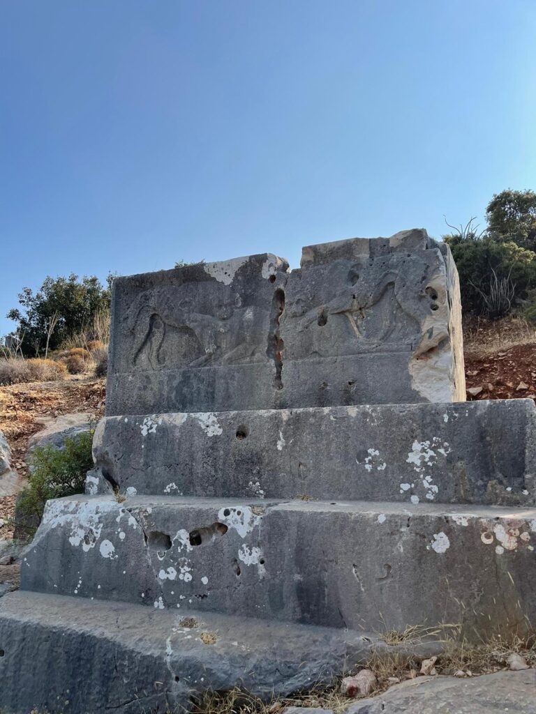 As we continue on the paved road, we come across a sarcophagus in the northeast of the city with engraved dancer figures on its lid, dated to the middle of the 4th century BC. Just like the excellently crafted Lycian sarcophagi, it rests on a massive stone pillar on a stepped base with the main part of the sarcophagus, the basin, and the saddle-shaped lid.